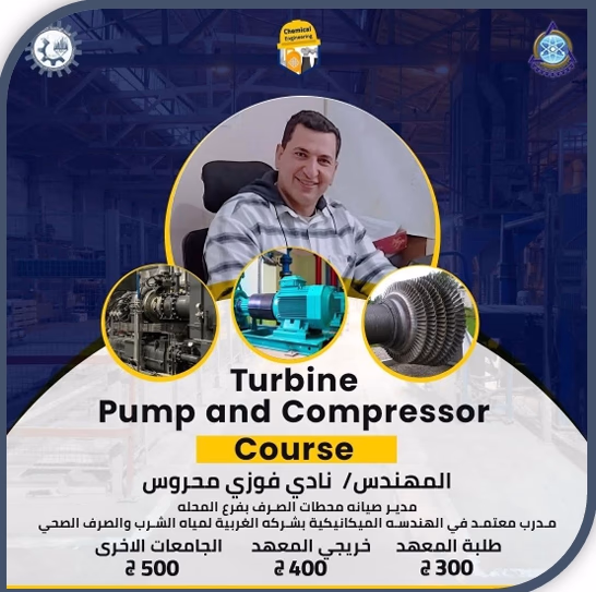 بعد موافقة كالً من (األستاذ الدكتور/عميد المعهد ، واألستاذ الدكتور/ رئيس قسم الهندسة الكيميائية)، تم عقد الدورة خميس عبر تطبيق الزوم ابتداءا ً من يوم ال "أون الين" والخريجين لطالب قسم الهندسة الكيميائية التدريبية )، وتم إختيار Pumps, compressors, turbines ، وذلك بعنوان ( معدات ميكانيكية 2026 / 1/ 29 الموافق المهندس نادي فوزي محروس "مهندس القوى الميكانيكية لدى الشركة الدولية لإلنشاءات والمدير التنفيذي لألعمال . مدربا ً الكهروميكانيكية لمشاريع الشركة بمحافظة دمياط"